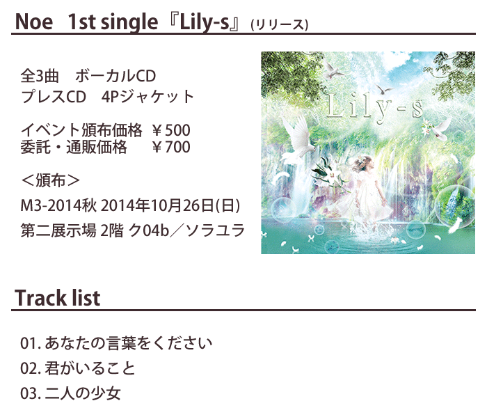 Noe Composed, Performed & All Chorus Arrangement by Noe Prodused by Sorayura Arranged by Euchaeta(01・02) aim(03) Mixed by Euchaeta Mastered by Takeomi Matsuura Mastered at Heaven+Hell masters, Tokyo Japan Art Direction & Design Bananan |